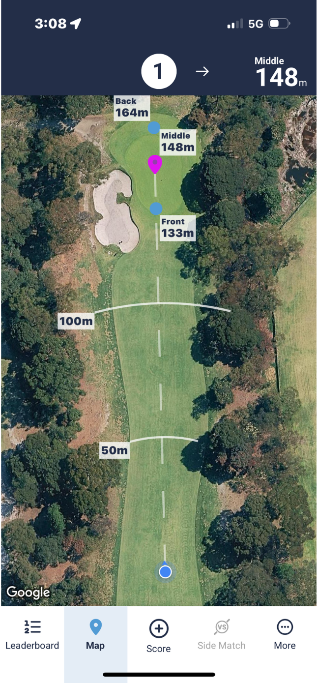 On aerial view select bunkers, fairways and greens to see the distance from your location. Handy for how far to carry the ball.