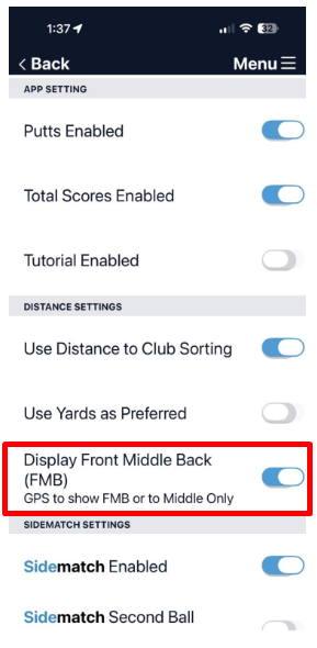 Once configured, App users can navigate to Menu -> Settings and then Toggle ‘Display Front Middle Back (FMB)’ to ON as per the screenshot below.